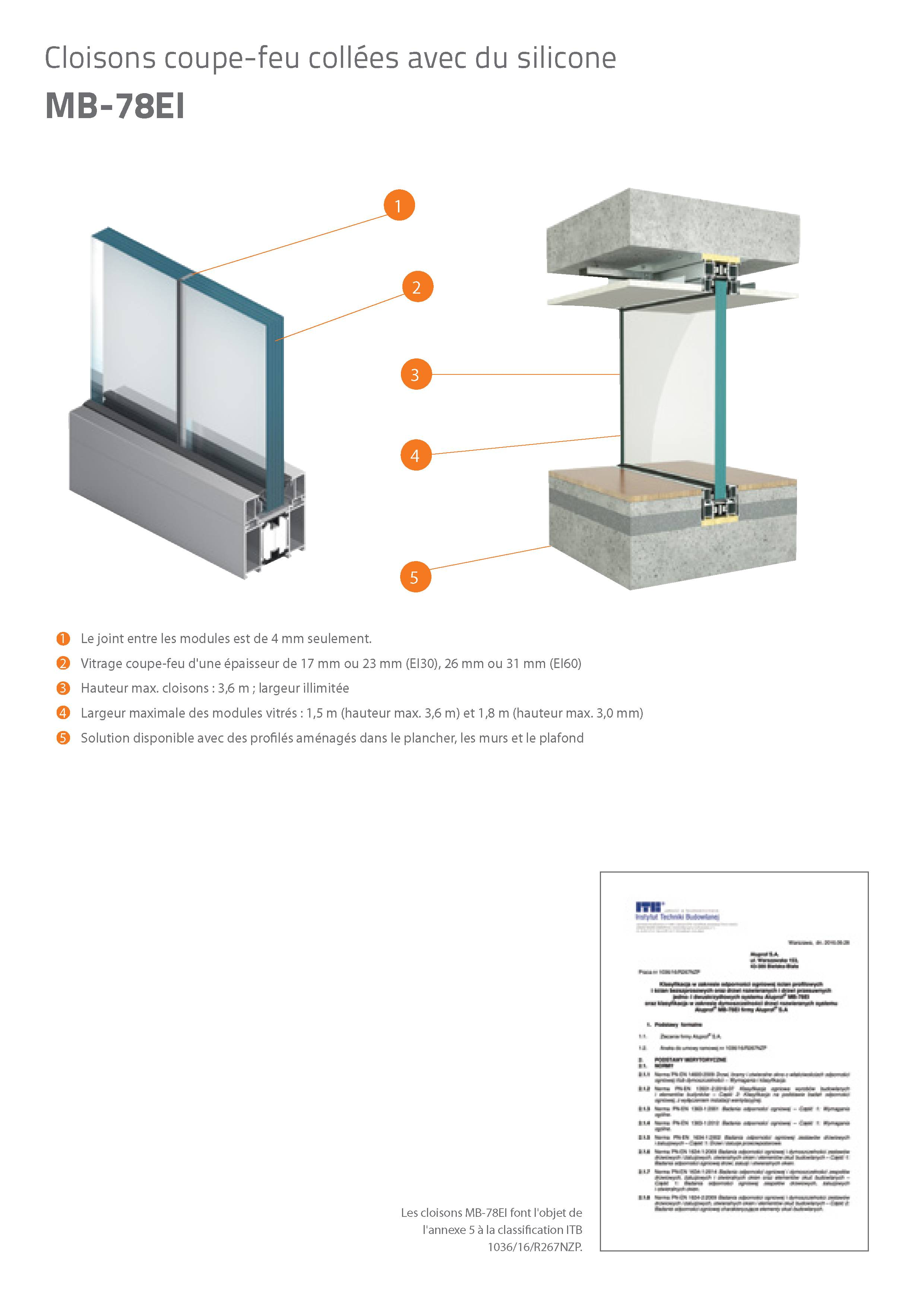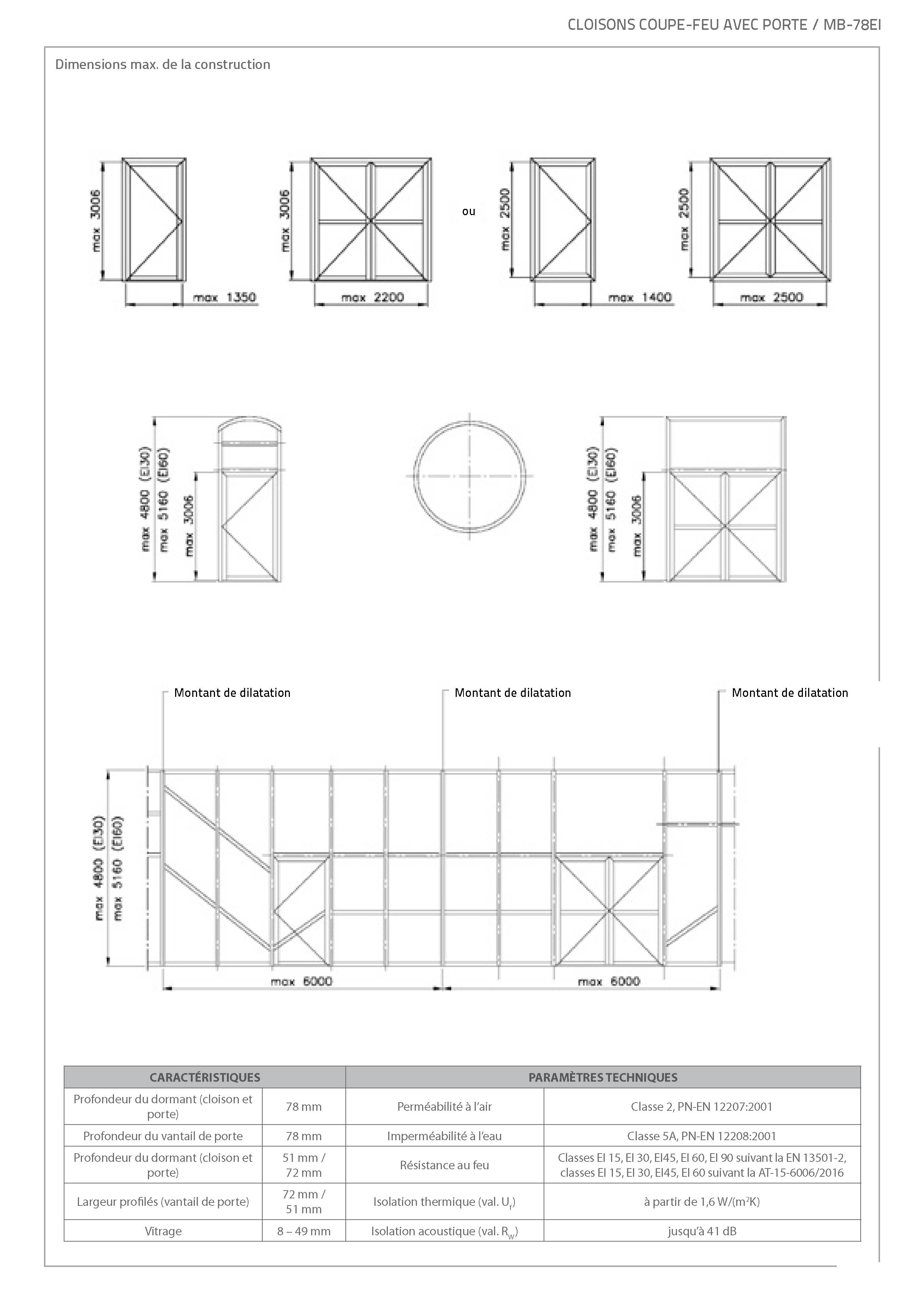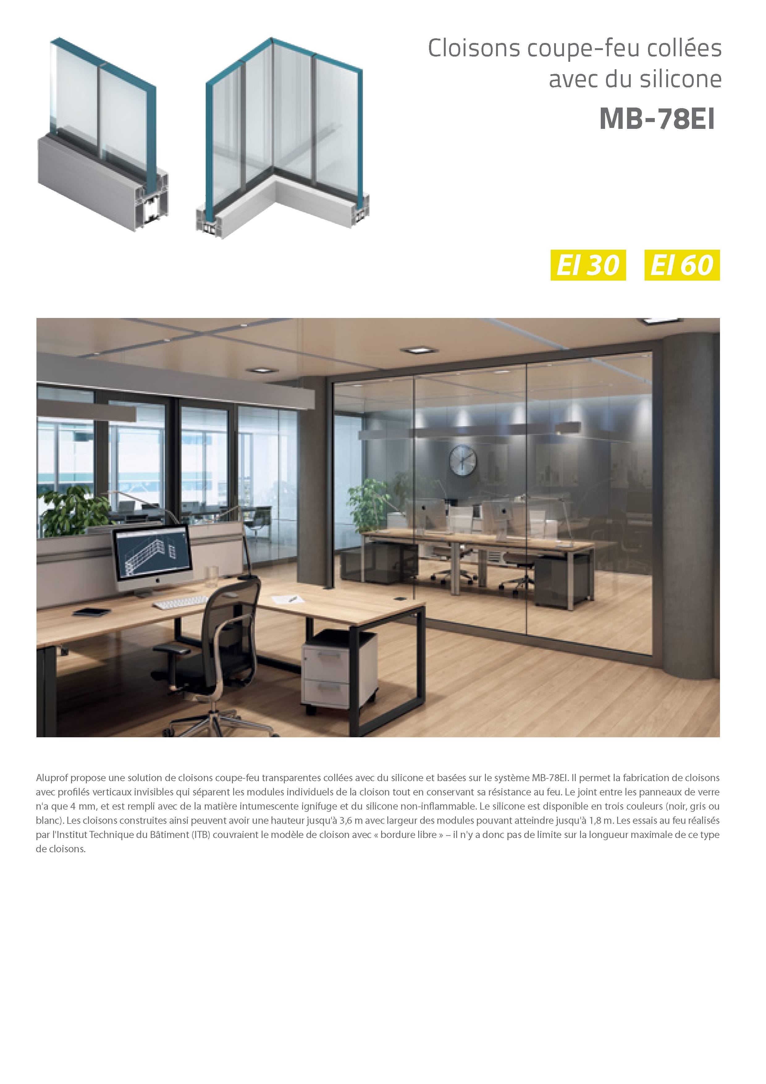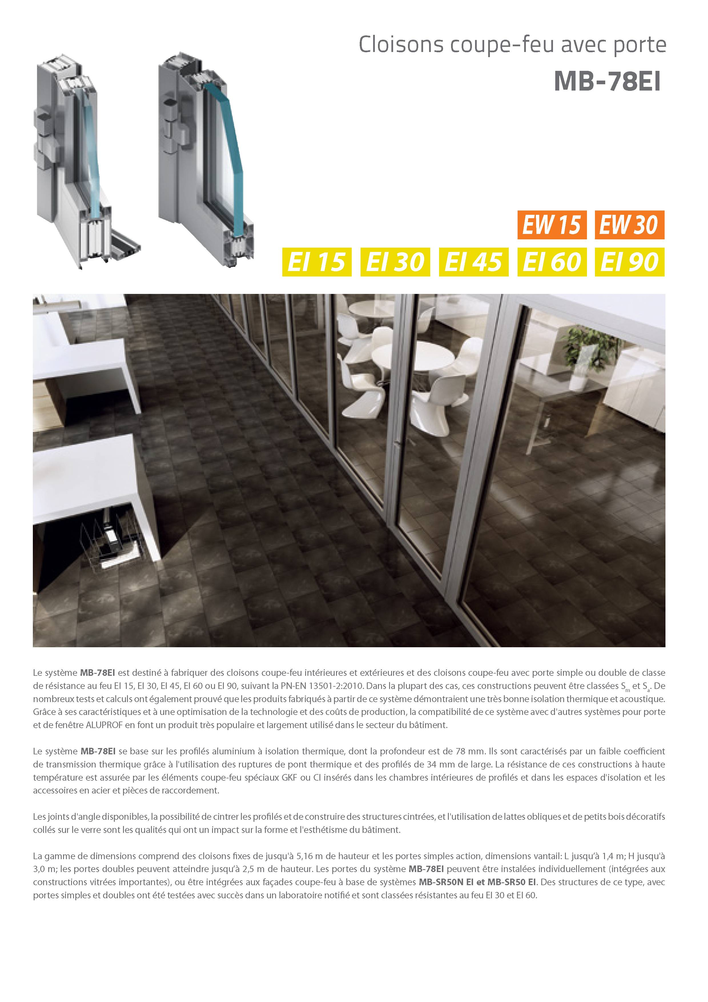 Les constructions système MB-78 EI reposent sur des profilés d'aluminium à isolation thermique. L'épaisseur de la construction est de 78 mm. Les profilés se caractérisent par leur coefficient de déperdition de chaleur (U) très faible car ils sont séparés par un profilé isolant de 34 mm de large. Le système supporte tous les types de vitrages de classe de résistance au feu appropriée (épaisseur de vitrage de 8 à 49 mm). Les cadres peuvent également être garnis de divers remplissages étanches à la fumée. Les essais réalisés par l'Institut des Techniques du Bâtiment à Varsovie ont en outre démontré que les cloisons construites au moyen de ce système se caractérisent également par une très bonne isolation acoustique (jusque 40 dB).