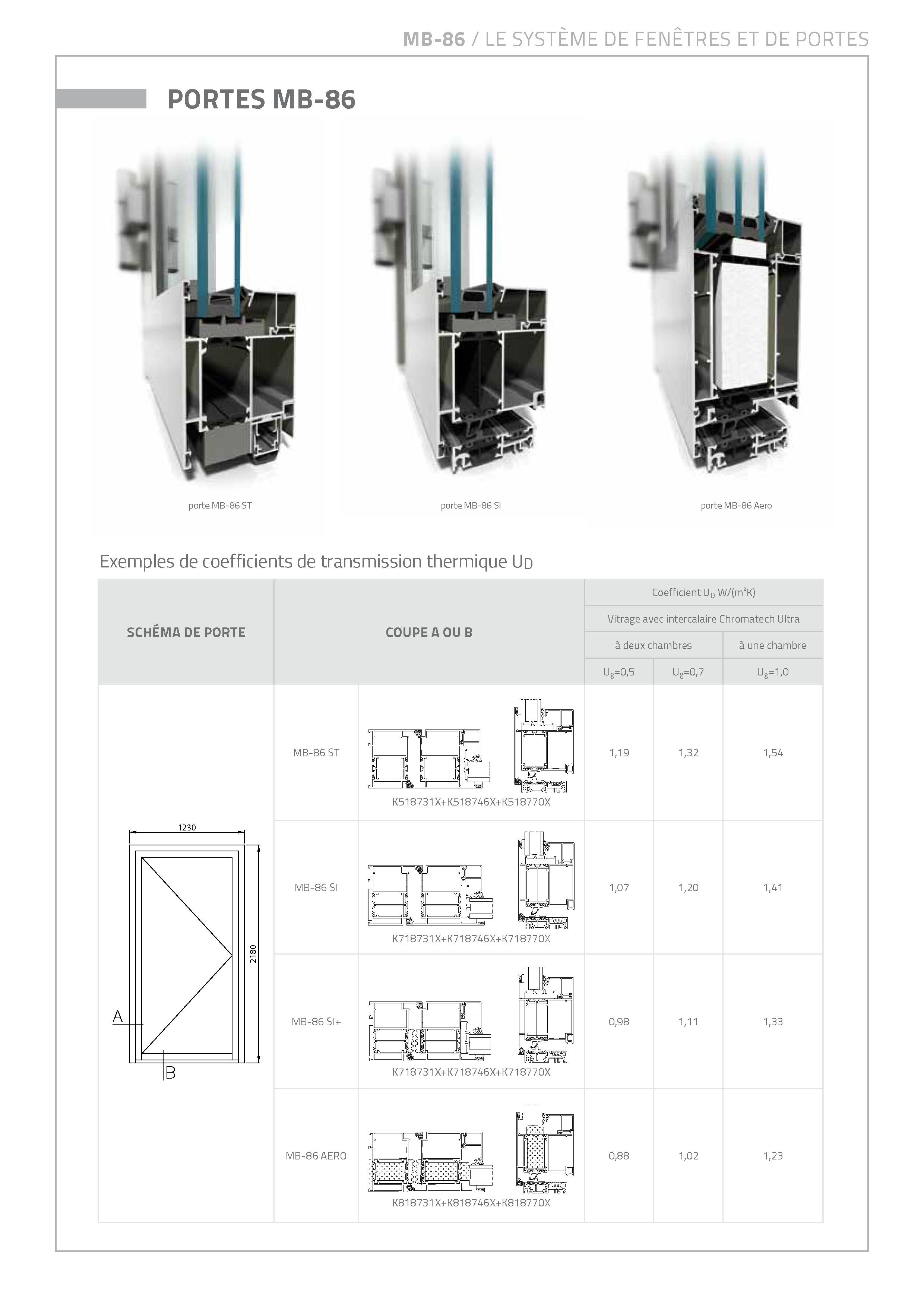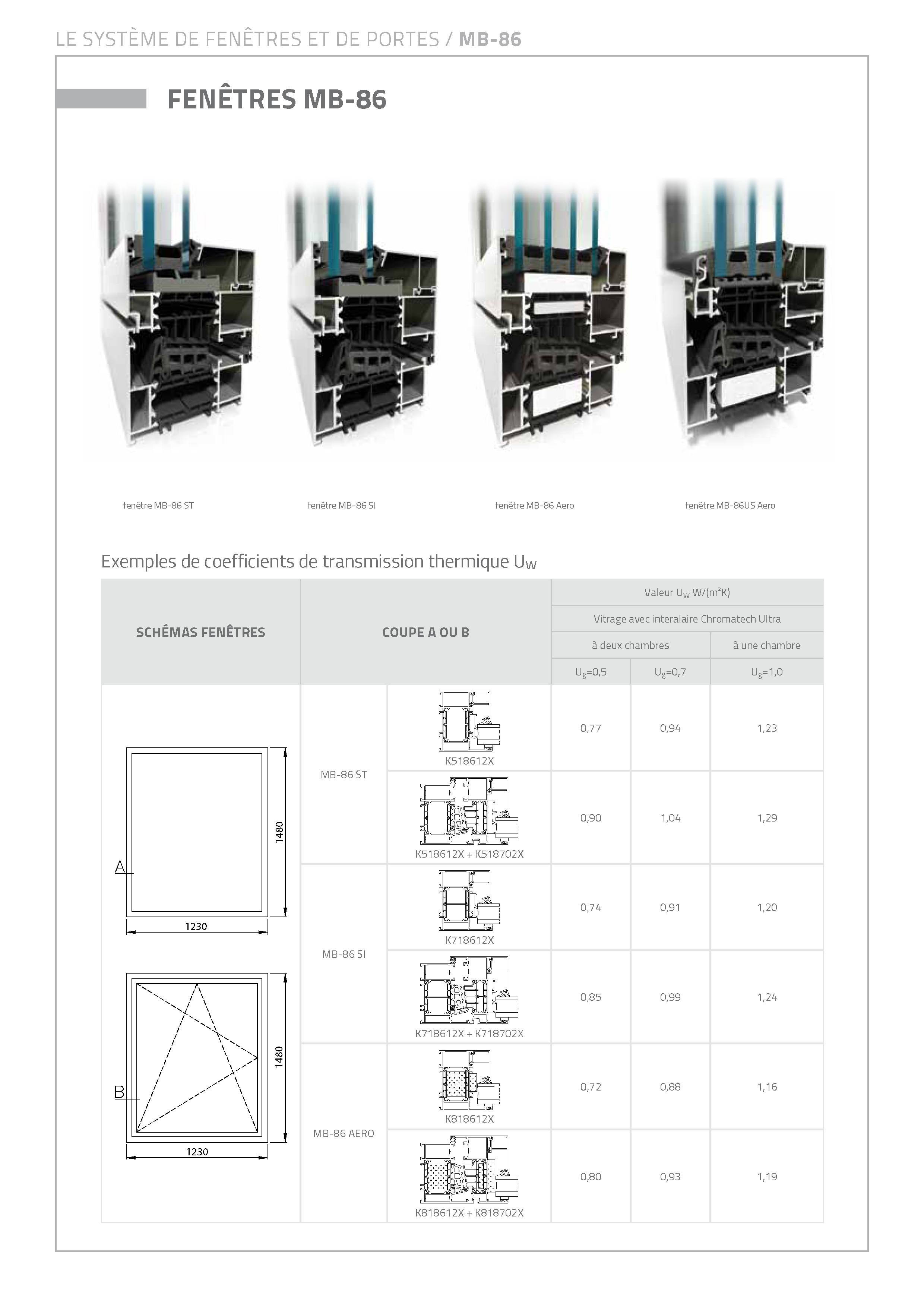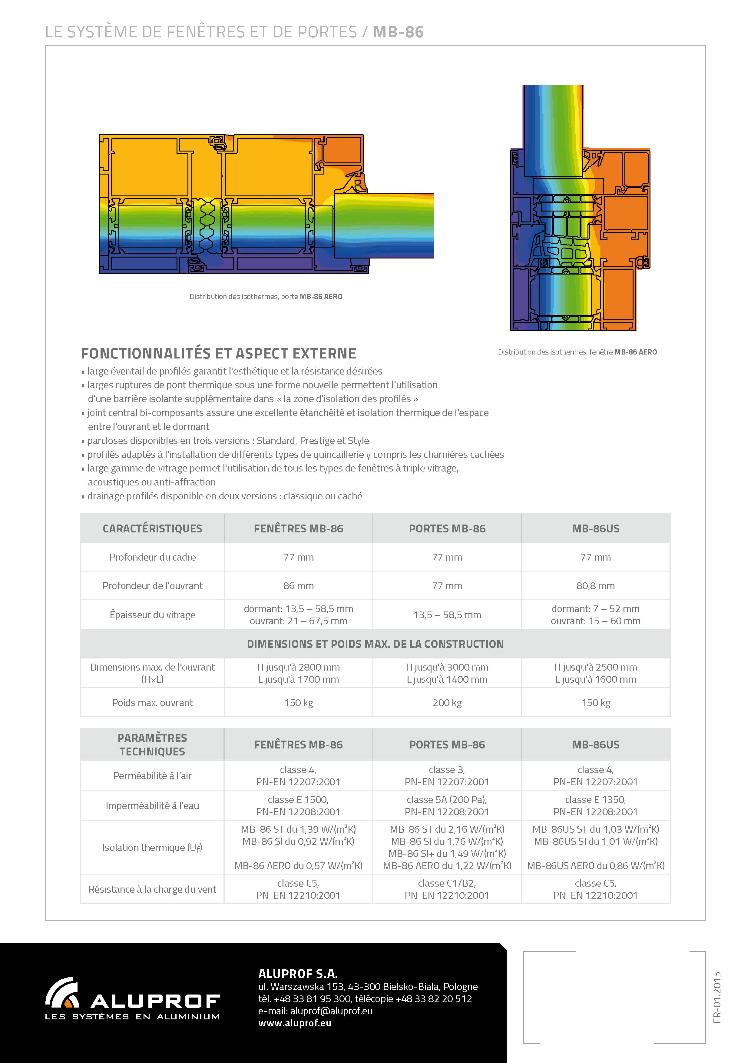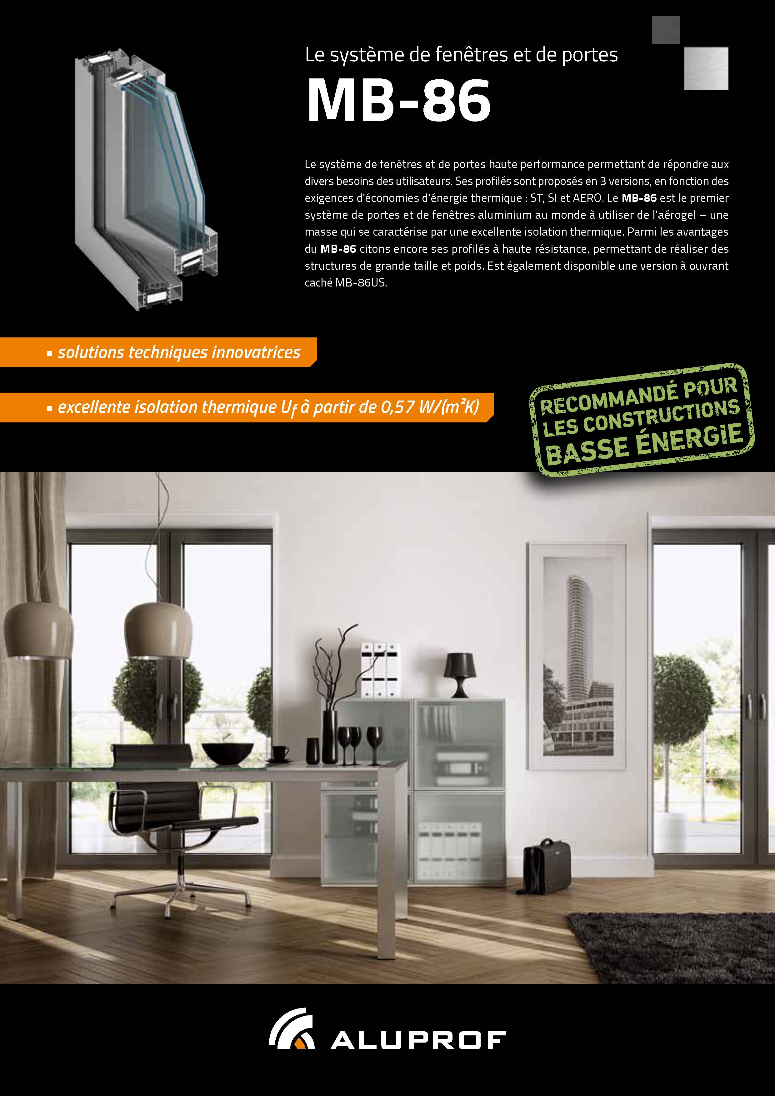 Système de portes et fenêtres de très bons paramètres répondant à une grande variété de besoins. Ses profilés existent en 3 variantes de construction applicables en fonction des attentes en matière d’économie de chaleur: ST, SI et AERO. MB-86 est le seul système existant de fenêtres aluminium à employer l’aérogel, un excellent isolant thermique. Un autre grand avantage du système MB-86 est la haute résistance de ses profilés qui permet de réaliser des fenêtres de plus grandes dimensions et poids.