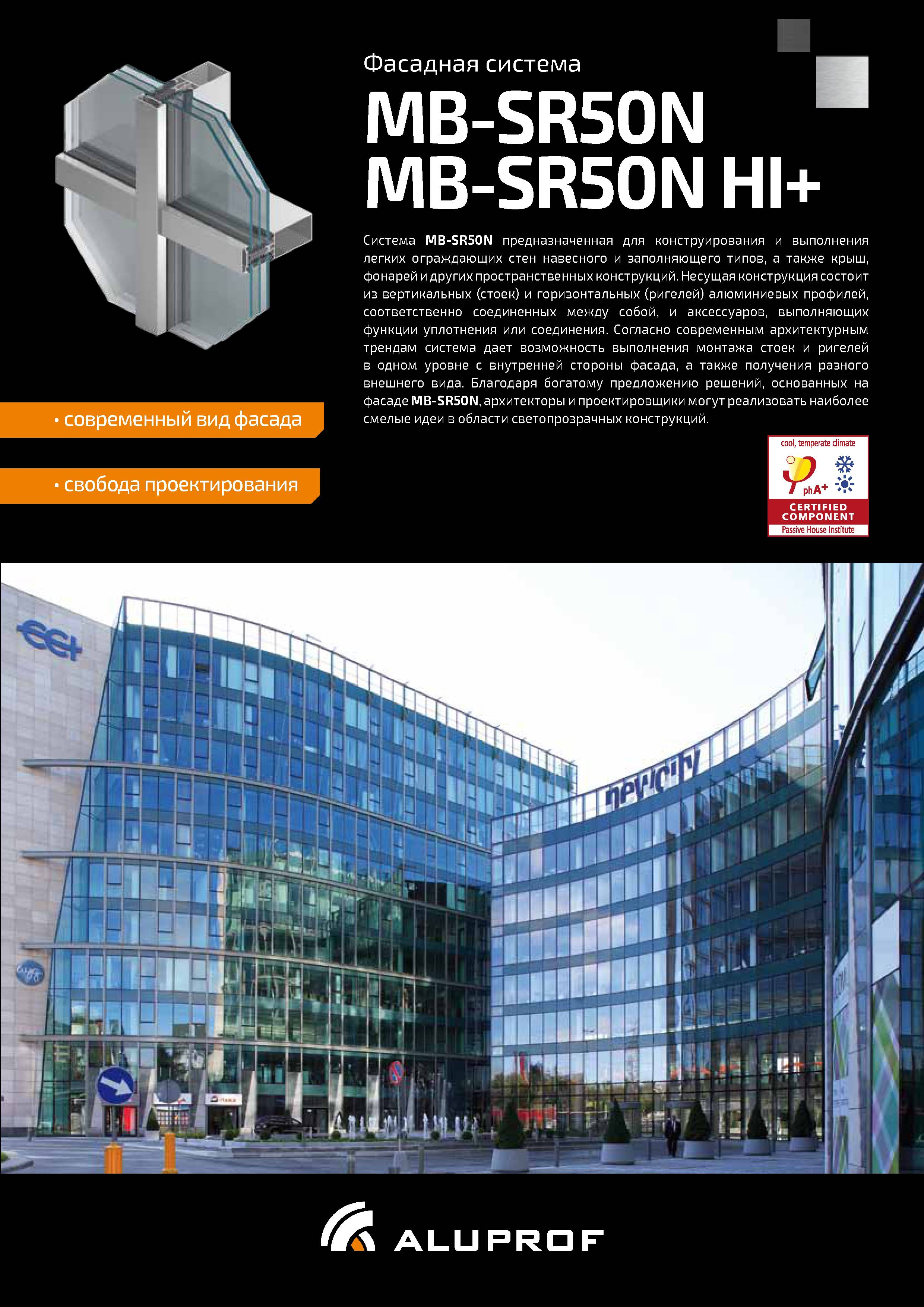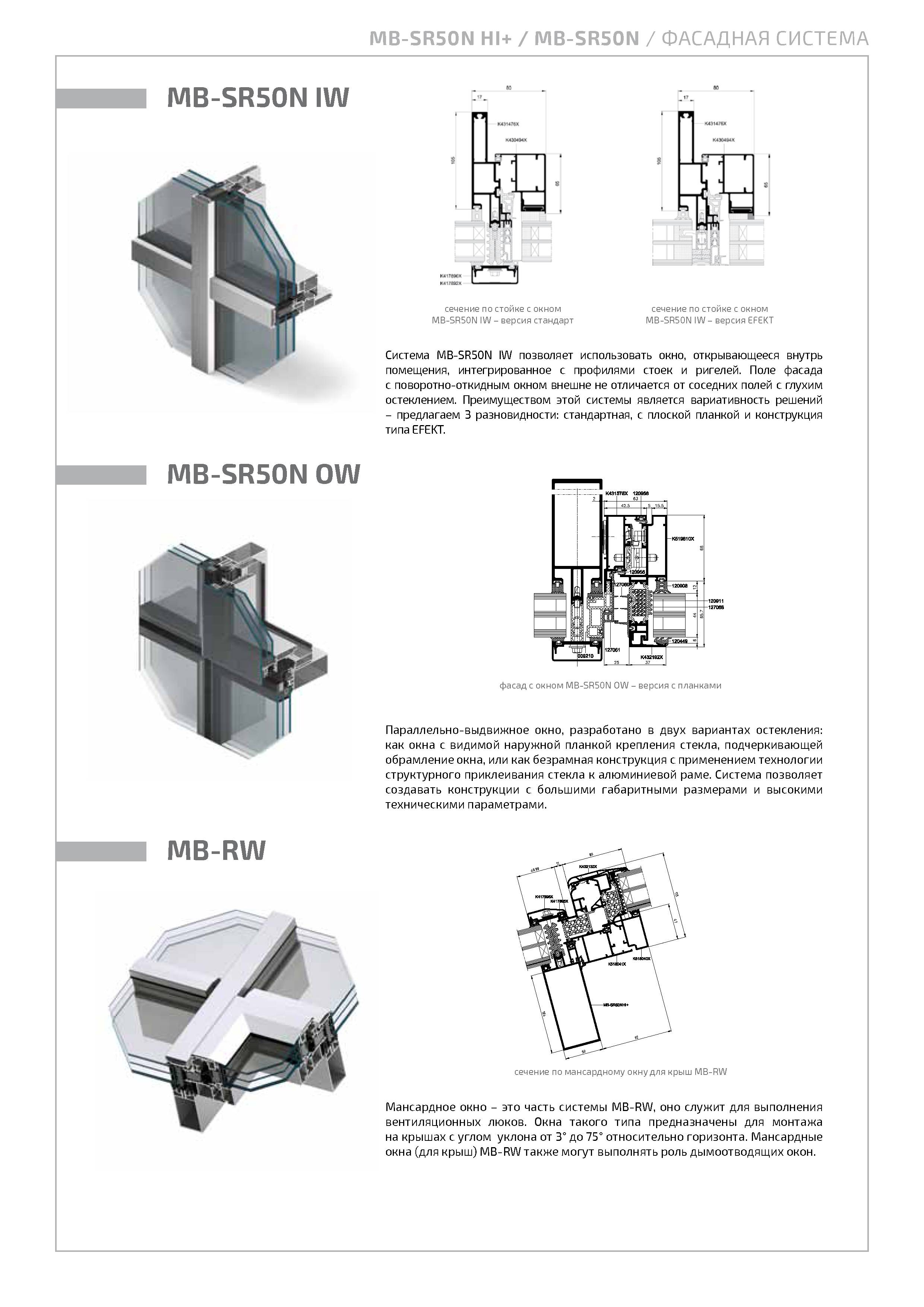 Система предназначена для конструирования и выполнения легких стеновых ограждений - плоских, подвесного и заполняющего типов, а также крыш, фонарей и других конструкций. Это модификация очень популярной системы фасада MB-SR50, выходящая навстречу актуальным стремлениям в архитектуре.