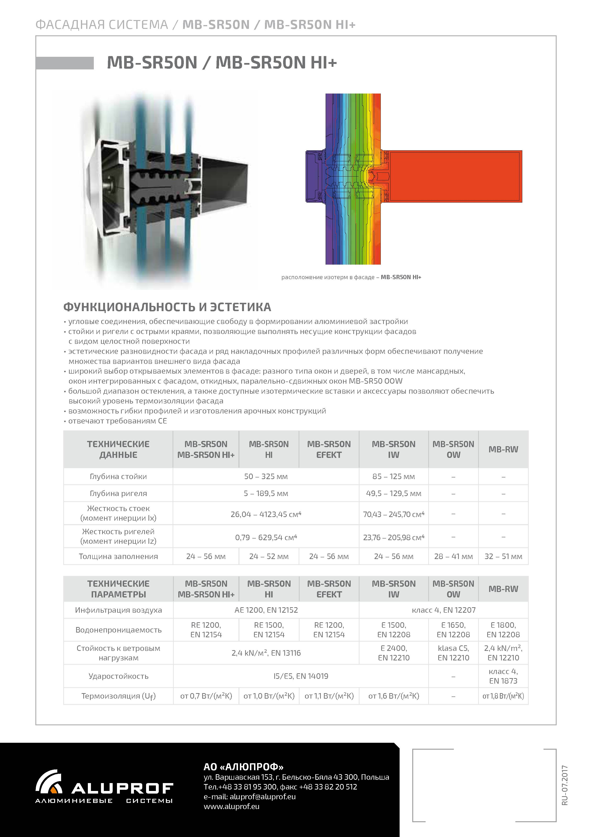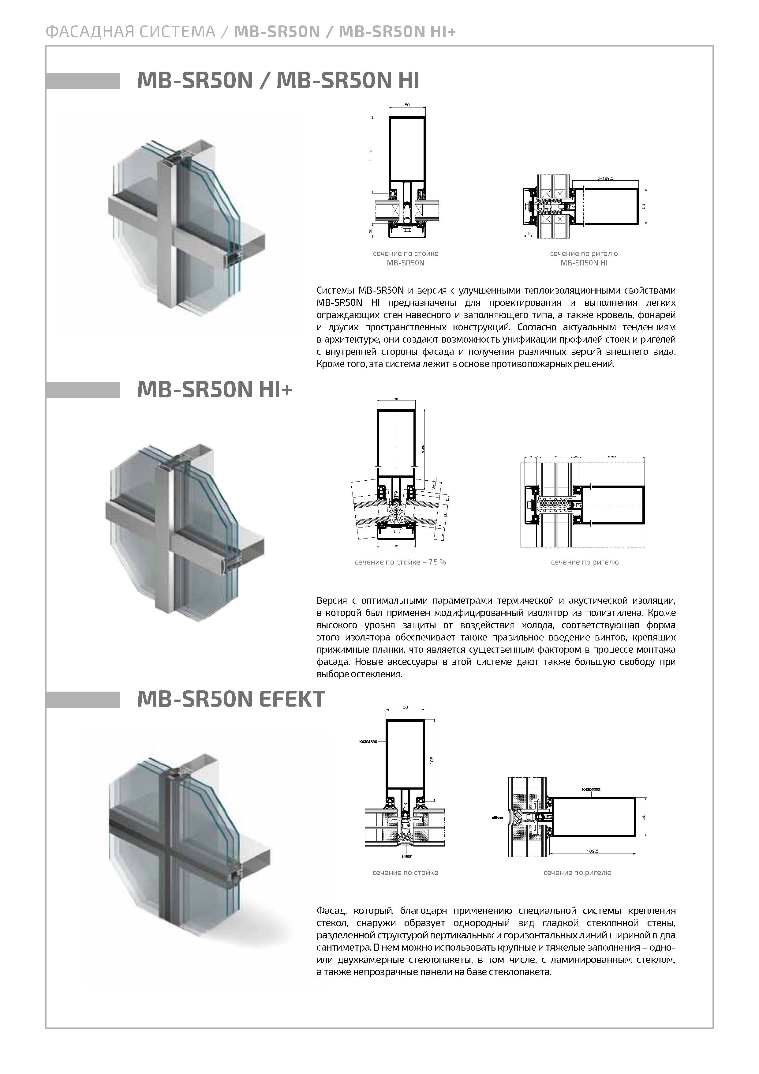 Эстетичным видом системы MB-SR50N, так как и в известных раньше опорно-ригельных фасадах являются версии: PL (так называемая горизонтальная и вертикальная линия, в которой подчеркнуто разделение – горизонтальное или вертикальное), а также полуструктурный фасад типа EFEKT. Особенного внимания заслуживает версия с повышенной термической изоляционной способностью MB-SR50N HI, в которой применены специальные двухкомпонентные изоляторы.
