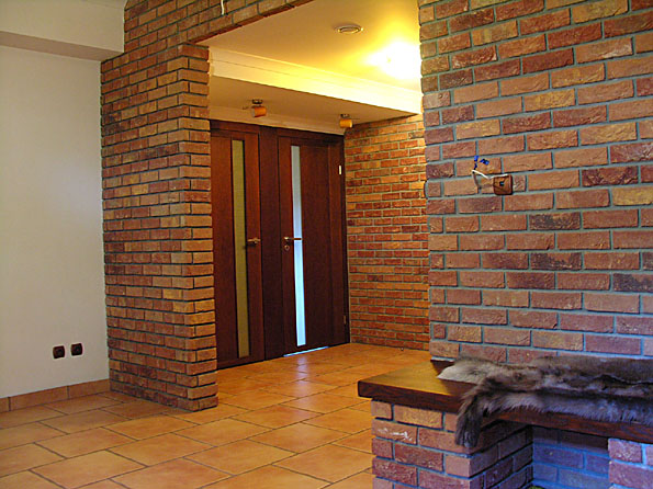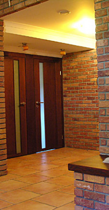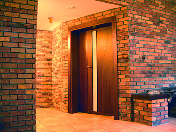 Двустворчатые двери прекрасно сочетаются с кирпичной отделкой интерьера. Нестандартные размеры и широкая дверная рама , выполненная из монолитного дуба удачно, дополняют эксклюзивный внешний вид.
